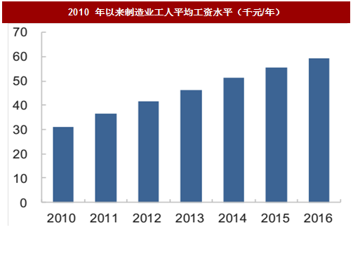 而 10 至 19 歲的人口數量占比在逐年減少。此消彼長之下,未來五年內,可工作人口數量將逐年減少。與此同時,制造業人員工資水平近年來也一直呈現增長趨勢,從 2010 年的 30916 元/年上升到 2016 年的59470 元/年,年均復合增速達到 11.52%??梢灶A見,未來的五年內,中國 20至 60 歲的可工作人口數量將不斷減少,制造業用人將變得愈加困難;而制造業工人工資水平的逐年上升將會增加企業用工成本。