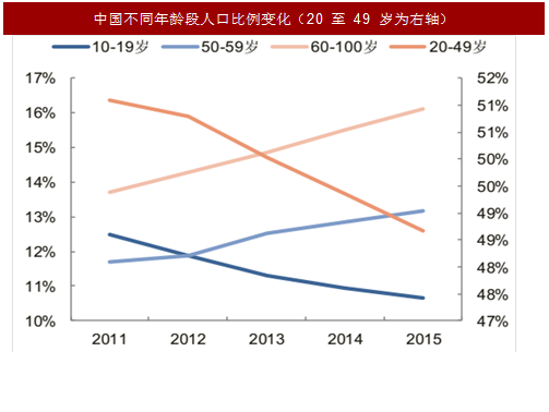 近年來,中國人口結構發生顯著變化,可工作人口數量明顯減少。我們將 20 至 60 歲年齡段的人群視為有勞動能力的群體。從統計數據看,2011 至 2015 年,60 歲以上的無勞動能力人口數量不斷增加,50 至 59 歲的可工作人口數量也持續增加。5 年后,這個年齡段的人將有很大一部分失去工作能力。