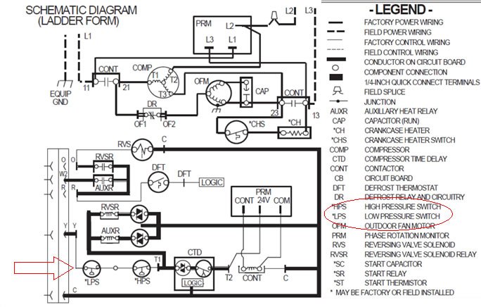 在下面的梯形圖邏輯示意圖中,您將在右下角看到一個紅色箭頭。紅色箭頭指向低壓開關(guān),低壓開關(guān)右側(cè)是高壓開關(guān)。這些壓力開關(guān)通過Y導(dǎo)線或端子連接到熱泵。在這種情況下,如果其中一個壓力開關(guān)跳閘,則該控制將終止整個冷凝裝置。遵循圖中接線的邏輯,Y線穿過壓力開關(guān),然后經(jīng)過壓縮機(jī)時間延遲。從時間延遲開始,邏輯跟隨壓縮機(jī)接觸器線圈。如果你停止壓縮機(jī)接觸器線圈的電源,你將殺死整個裝置。當(dāng)線圈斷電時,壓縮機(jī)接觸器接觸打開。如果其中一個制冷壓力開關(guān)打開會發(fā)生這種情況。