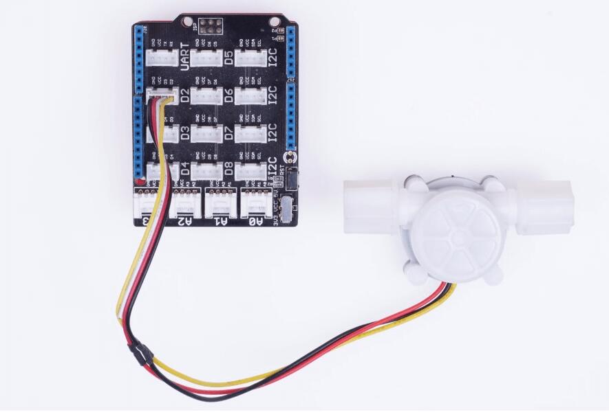 適用于基于Arduino UNO和Seeeduino V4.2的基于Atmega 328的主板。有兩個(gè)數(shù)字引腳可以用作中斷。數(shù)字引腳2用于中斷0,數(shù)字引腳3用于中斷1。在本博客中,我們使用D2引腳檢測(cè)水流傳感器輸出的脈沖。如果您使用的是Seeeduino + Grove基座護(hù)罩,只需將水流傳感器插入D2連接器即可。如果您正在使用其他Arduino開(kāi)發(fā)板,請(qǐng)使用跨接電纜連接到正確的引腳。