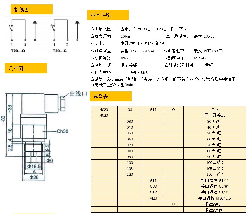原理結(jié)構(gòu): NC20系列采用雙金屬片原理,當(dāng)溫度達(dá)到設(shè)定值時(shí),繞制成環(huán)性彎曲狀的雙金屬片的端受熱膨脹觸發(fā)內(nèi)置機(jī)械裝置,開(kāi)關(guān)動(dòng)作。 NC20系列溫度開(kāi)關(guān)可滿足液壓,潤(rùn)滑,傳統(tǒng)系通中對(duì)于溫度控制的不同要求,用于檢測(cè)溫度是否超過(guò)最高限或最低限。特點(diǎn): NC20與介質(zhì)接觸部分全部采用黃銅材料,接口螺紋有G1/4,G1/2,M20×1.5三種可供選擇,溫度范圍:30℃............120℃。應(yīng)用: NC20系列溫度開(kāi)關(guān)可滿足液壓,潤(rùn)滑,傳統(tǒng)系通中對(duì)于溫度控制的不同要求,用于檢測(cè)溫度是否超過(guò)最高限或最低限。
